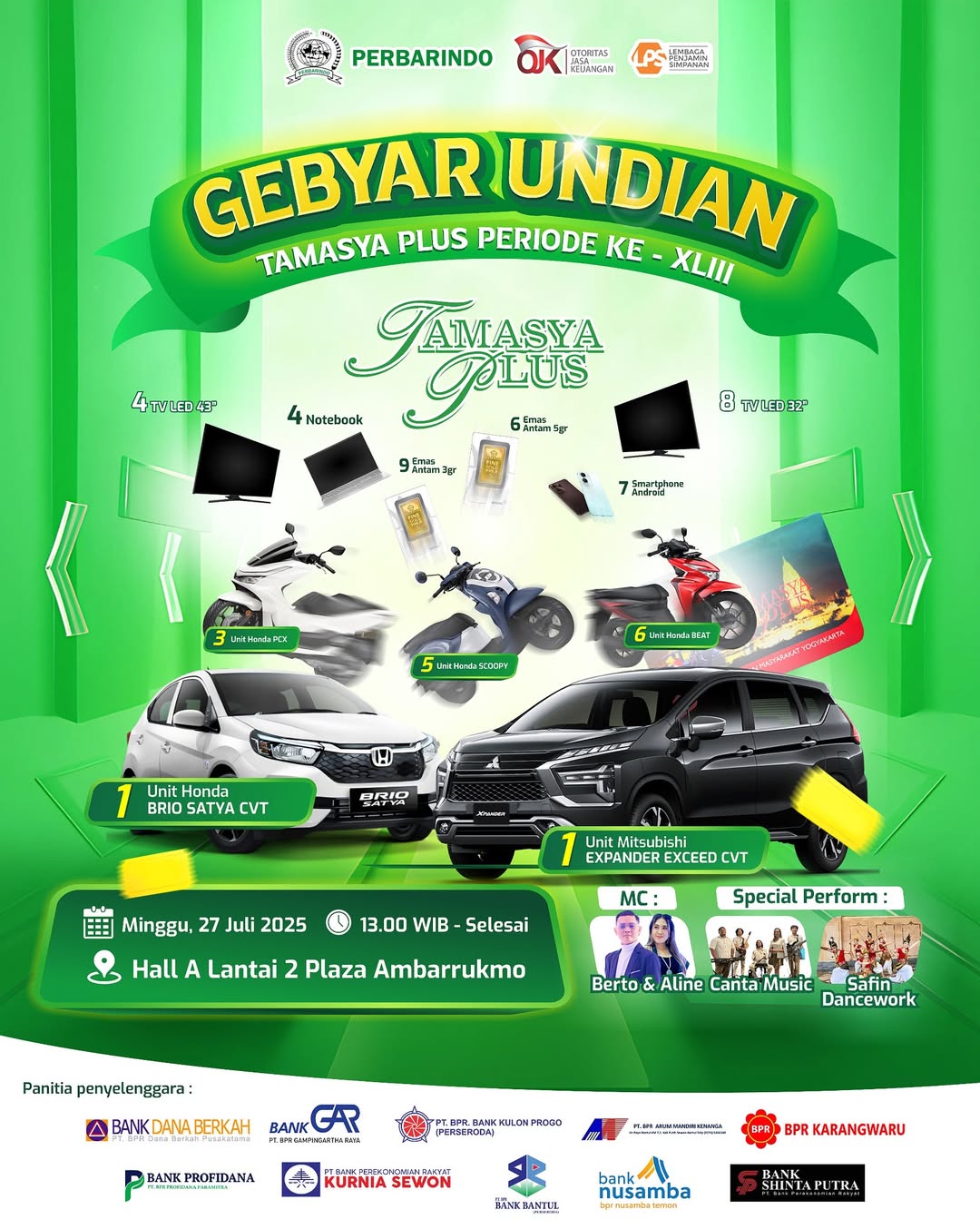 Yogyakarta, 27 Juli 2025 – Program unggulan Tabungan Tamasya Plus kembali menggelar Gebyar Undian Periode ke‑43 dengan meriah dan penuh kejutan. Bertempat di Hall A Lantai 2 Plaza Ambarrukmo, acara ini menjadi bukti nyata komitmen 42 BPR anggota DPD Perbarindo DIY dalam memberikan apresiasi kepada nasabah setia.